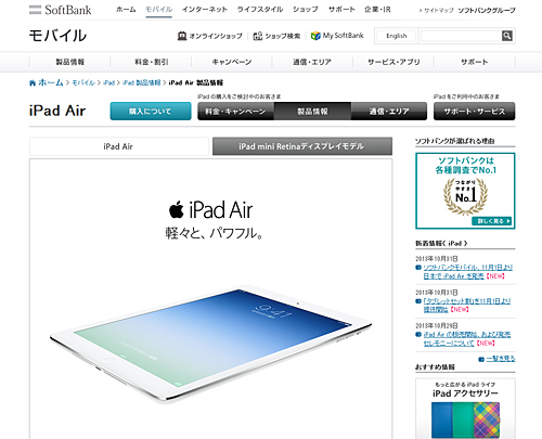 「iPad Air」のWi-Fi + Cellularモデルは、全国のiPad取扱店とソフトバンクオンラインショップで販売する。Wi-Fiモデルは、オンラインショップでは取り扱わない。