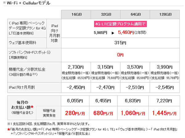 料金プランは従来と同じ。Wi-Fi + Cellularモデルの本体価格は、「iPad Air」の16GBが6万5520円、32GBが7万5600円、64GBが8万5680円、128GBが9万5760円、「iPad mini Retinaディスプレイモデル」の16GBが5万5440円、32GBが6万5520円、64GBが7万5600円、128GBが8万5680円だが、機種に応じて最大24か月、一定の金額を割り引く「月月割」適用後の実質負担額は、「iPad Air」が6720円(月額280円×24回)から、「iPad mini Retinaディスプレイモデル」は0円から。さらに、「タブレットセット割」「スマホまとめて割」「スマホファミリー割」「スマホ下取り割」などの割引・キャンペーンを提供する。
