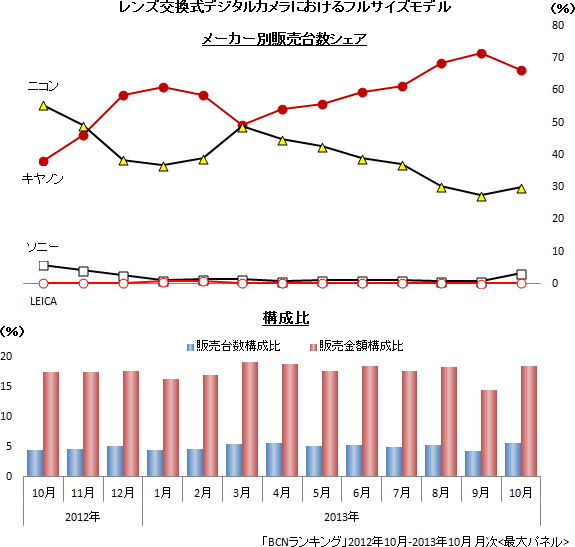 実は、ニコンはこのところフルサイズモデルで競合のキヤノンに大きく後れを取っている。全国の主要カメラ・家電量販店の実売データを集計する「BCNランキング」で、フルサイズ撮像素子を搭載したレンズ交換式デジタルカメラに限ってメーカー別販売台数シェアを比較すると、ニコンの不振が目立つ。2012年まではキヤノンと拮抗していたが、今年4月以降。徐々に差が開き、この10月はニコンの30.2%に対し、キヤノンは66.3%というダブルスコアで差をつけられている状況だ。