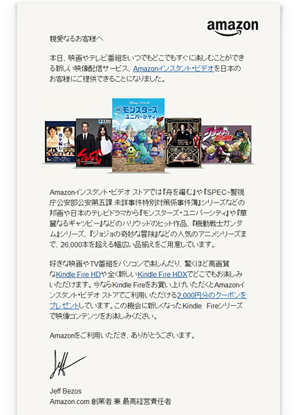 Amazon.co.jpは、サービス開始を記念して、人気映画が100円(SD画質)または200円(HD画質)でレンタルできるキャンペーンを12月31日まで実施する。また、12月15日23時59分までに、Kindle Fire HDXシリーズ、Kindle Fire HDの新モデルを注文した人に、「Amazon インスタント・ビデオ」のコンテンツ購入に利用できる2000円分のクーポンをプレゼントするキャンペーンを実施する。