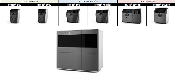 粉末焼結積層型の「ProJet X60シリーズ」は、ハイエンドモデルの「ProJet 860Pro」「ProJet 660Pro」、スタンダードモデルの「ProJet 460Plus」「ProJet 360」、エントリモデルの「ProJet 260C」「ProJet 160」の計6機種。最大造形サイズは500×500×500mm。価格は問い合わせ。