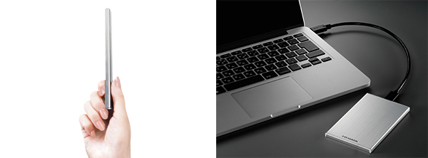 美しさと強さを兼ね備えた超薄型アルミパネルを採用し、11月28日現在、USB 3.0接続の2.5インチ外付HDDとして世界最薄を実現した。USBバスパワー駆動に対応し、Windows PCやMacとUSBケーブルでつないで使うことができる。サイズは幅約75×奥行き124×高さ7mmで、重さは約130g。
