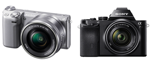 ソニーの「NEX-5R」(左)と最新機種の「α7」