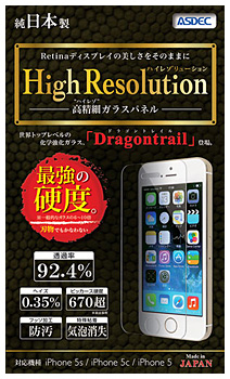 さまざまな強度試験をクリアした世界トップレベルの化学強化ガラス「Dragontrail」を採用したiPhone 5s/5c/5対応の液晶保護ガラスパネル。透過率92.4%、ヘイズ値(濁り度)0.35%と、貼りつけていることを忘れてしまうほどの非常に高い透明度を誇る。