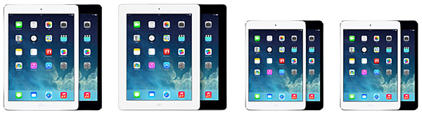 (左から、iPad Air、iPad Retinaディスプレイモデル、iPad mini Retinaディスプレイモデル、iPad mini)