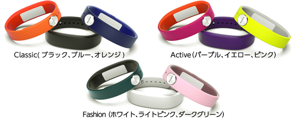 「SmartBand SWR10」には、ブラックのリストバンド(Sサイズ・Lサイズ)が付属。コアはリストバンドから着脱でき、別売のカラーバリエーションに加え、今後、他社が発売を予定しているリストバンドなどに装着して使うこともできる。オプションバンドは、3色セット(Sサイズ・Lサイズ)で、6月以降に発売予定。カラーは、「Classic」のブラック、ブルー、オレンジ、「Fashion」のホワイト、ライトピンク、ダークグリーン、「Active」のパープル、イエロー、ピンクの全9色。