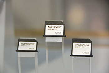 このほか、MacBook Air/Pro向けの専用メモリカード「JetDrive Lite」も展示。専用メモリカードスロットに挿入して使う追加ストレージで、専用メモリカードスロットからはみ出さないデザインを採用している。持ち運びの際にじゃまにならず、MacBookのストレージ容量を増やすことができる。最大読込み速度は毎秒95MB、最大書込み速度は毎秒60MBで、価格は64GBが7980円、128GBが1万4800円。
