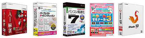 「『ソフ得』ソフト使い放題 by OPTiM」の主な対象ソフト。左から、「AI麻雀」「パーフェクトタイピングレッスン」「ウルトラパソコン高速化 for Windows 7」「ミラクルゼミナール 小学3年生」「Shade 13」
