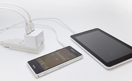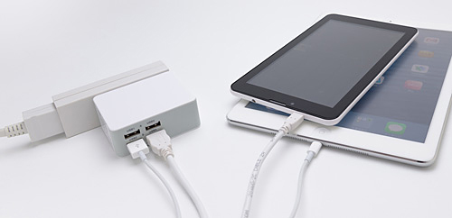 タブレット端末/スマートフォンの充電や、iPad Airの急速充電に対応。2ポートの「LA-17W5U2」は、タブレット端末とスマートフォンの同時充電やスマートフォン2台の急速充電もできる。4ポートの「LA-24W5U4」は、iPad Airやタブレット端末の2台同時充電、タブレット端末1台とスマートフォン2台の同時充電、スマートフォン4台の同時急速充電ができる。