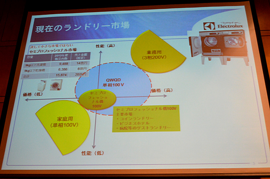 発表会で、プロフェッショナル部門の日本・韓国統轄・浅井伸宏氏は「日本ではスティック型クリーナーのブランドとしてよく知られているが、実は販売構成比の約3割は業務用のランドリーやキッチンシステムだ」と日本市場での製品展開を説明。家庭用と業務用で幅広い製品を提供していることを強調する一方で、「業務用と家庭用の間には、大きな空白市場がある」と、新製品のターゲットを示した。