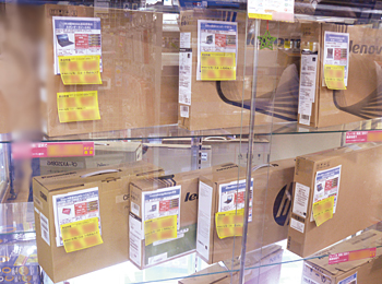 モバイルWiMAXもカーバッテリも、来店客との会話や問い合わせの電話で出てくるのは、「インターネットで見た」という言葉。そこで、自社の通販サイト「e-zoa.com」との連携を強化して、サイト上でZOA秋葉原本店の在庫情報を商品ごとに閲覧できるようにした。もちろん、店頭でもサイトと同じ価格で購入できる。これによって、「サイトで閲覧して、店頭で商品を実際に触ってみて購入するというお客様が増えた」という。一方、パソコンに関しては、サイトでスペックと価格だけを把握して購入するお客様が多く、とくに組み立てて展示する必要がない。ショーケースに箱を並べるだけなので、「狭い売り場でも販売できる」という。