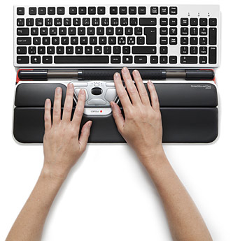 キーボードの手前に置いて使うユニークな形状のマウス。マウス使用時の腕の移動やクリック・スクロールなどの負担を最小限に抑える。左クリックとカーソル移動を実行するローラーバー、コピーボタン、ペーストボタン、左クリックボタン、右クリックボタン、スクロールホイール、ダブルクリックボタンを搭載する本体に、手の形状に合わせてデザインした使い心地のよいパームレストが付属する。