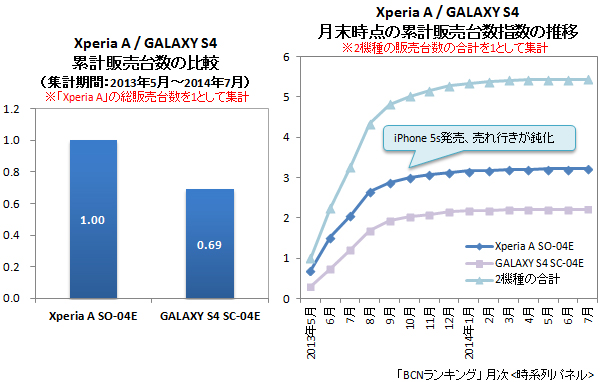 家電量販店の実売データを集計した「BCNランキング」によると、「ツートップ」の対決の結果は、最終的に「Xperia A SO-04E」の圧勝に終わった。「Xperia A SO-04E」と「GALAXY S4 SC-04E」の累計販売台数の比率はほぼ6対4。発売当初から「Xperia A SO-04E」に人気が集中し、「GALAXY S4 SC-04E」が盛り返した時期もあったが、差は縮まらず、半々にはならなかった。