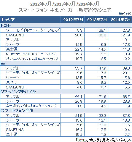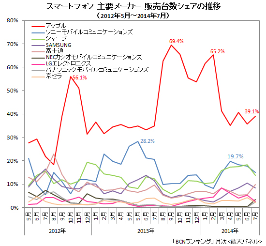 ただし、アップル以外の多くのメーカーは、2013年9月以降、おおむね前年割れで販売台数減を余儀なくされている。ドコモをはじめとするキャリアの戦略によって、明暗が分かれたかたちだ。ソニーモバイル、シャープ、LG、京セラは月によっては前年を超え、なかでもシャープは、夏モデル発売後の今年5~7月は前年同月比116.8~171.2%と好調だ。トップを独走し、今年3月に前年の2倍以上となるケタ違いの販売台数を叩き出したアップルも、4月以降は前年の6~9割程度にとどまり、スマートフォンの販売規模は急激に縮小しつつある。