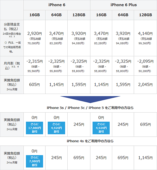 下取り対象機種は、iPhone、Androidスマートフォン、Windows Phone、BlackBerry、従来型携帯電話。例えば、iPhone 5sの64GB、GALAXY S5、Xperia Z2、Xperia ZL2の場合は4万3200円(1800円×24か月)、iPhone 5sの32GBは4万1040円(1710円×24か月)割り引く。乗換え対象機種は、「iPhone 6」「iPhone 6 Plus」、SoftBankスマートフォン、シンプルスマホ、SoftBank 3G携帯電話。