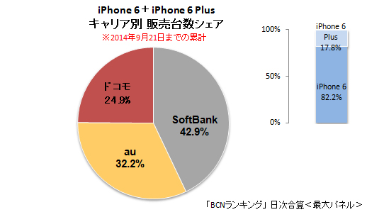 「BCNランキング」によると、9月21日までの「iPhone 6」と「iPhone 6 Plus」を合わせたキャリア別販売台数シェアは、ソフトバンクモバイル42.9%、au32.2%、ドコモ24.9%。国内初代モデルの「iPhone 3G」からずっとiPhoneを取り扱ってきた「老舗」のソフトバンクが全体の4割強を占め、1年のうち最もiPhoneに対する注目度が高い「発売直後3日間=発売第1週」のシェア争いを制した。