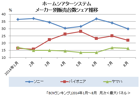 家電量販店の実売データを集計する「BCNランキング」をもとに、昨年の販売数量が多かったメーカーを表彰する「BCN AWARD 2014」で、ソニーはホームシアターシステム部門で最優秀賞を受賞した。今年も1月から8月まで、8か月連続でメーカーシェア1位を維持している。