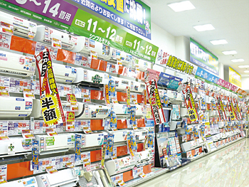 ノジマ横須賀店の売り場面積は約4960m2で、ノジマのなかではトップスリーに入る大型店舗だ。品揃えは最大規模を誇る。佐藤執行役は、「リゾート都市には、最先端の商品がふさわしい。最新機種をいち早く並べて販売するようにしている」と、横須賀の地域特性に合わせた戦略を語る。また、「商圏は半径10km前後を想定している。幅広い客層に対応できるよう、上位機種から下位機種まで、何でも揃っていることも強みだ」という。白物家電のなかでも、エアコンは壁一面にずらりと商品を展示。佐藤執行役は、「オープニングセールでは、エアコンが爆発的に売れた。6月という季節的な要因もあるが、展示機種が豊富なことにお客様が満足されていた」と、好調の要因が品揃えにあると分析する。