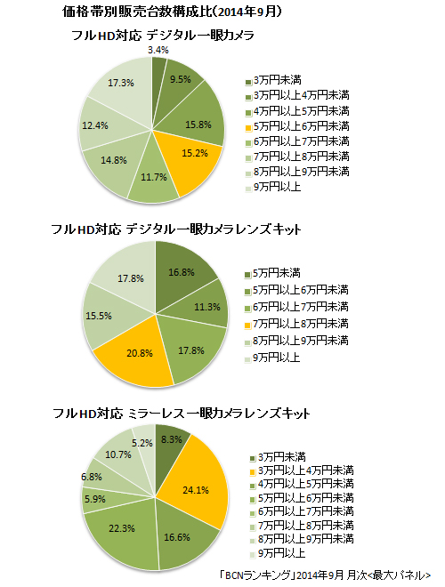 軽量・コンパクトなミラーレス一眼は、パナソニックの「LUMIX G」シリーズやニコンの「Nikon 1」シリーズなど、充実した動画撮影機能をウリにする製品が多い。今年9月のデジタル一眼カメラ全体の税別平均単価は約7万6000円で、ミラーレス一眼のレンズキットに限ると約5万5000円、デジタル一眼レフのレンズキットに限ると約8万3000円だった。見た目こそ異なるものの、平均単価がともに5万円前後と手頃なミラーレス一眼カメラとビデオカメラは、機能でも価格でも競合している。