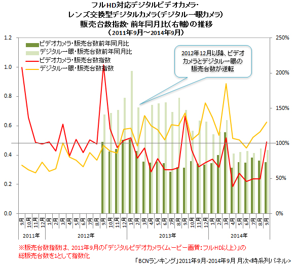 一般的な形状のデジタルビデオカメラは、2013年2月以降、消費税増税前の駆け込み購入の影響で好調だった今年3月を除き、月間販売台数はずっと前年を下回り、伸び悩んでいる。未婚化・少子化の影響で、メインターゲットであるファミリー層が減っているうえ、かつては6~7年周期だった買替えがなかなか進まず、ミラーレス一眼カメラやスマートフォンなど、同じように動画を撮影できるほかのデバイスに新規購入や買替えニーズの一部が流れているとみられる。