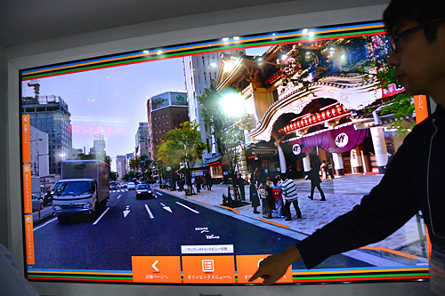 パナソニックブースのデモンストレーションでは、駅や商業施設などに設置して案内板としての使用することを視野に入れて、地図を表示。画面に触れるほど近距離に寄っても、映像の荒さはまったく目につかない。書き込まれた地名などの文字をクリアに視認できた。