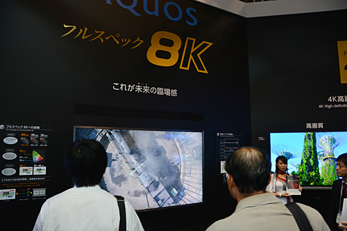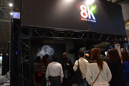 4Kの先にある8K化も順調だ。当初の計画よりも4年前倒しで、2016年に試験放送を開始する8K放送。NHKとJEITAの共同ブースでは、8Kディスプレイや8Kブロジェクターを参考展示している。