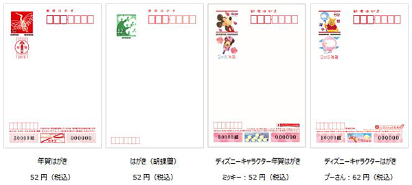 税込み価格は、干支などのイラストや家族の写真を入れた「標準デザイン」の場合、普通紙の年賀ハガキが78円、写真用紙(年賀ハガキ/ディズニーキャラクター年賀ハガキ)がそれぞれ108円。人気キャラクターなどの「プレミアムデザイン」は、普通紙の年賀ハガキが130円。このほか、喪中・寒中デザインは68円。それぞれ、ハガキ代が別途必要。10枚以上注文すると、印刷代が最大30%割引になるサービス「まとめ割」が利用できる。当日15時までの注文分の翌日発送や、一度の注文で複数のデザインにも対応する。