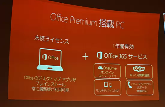 「Office Premium」は、永続ライセンスと1年間有効の「Office 365サービス」をセットにしたもの。「Office Premium」はパートナーであるメーカー各社のPCとマイクロソフト製タブレット端末「Surface Pro 3」にプリインストールして提供する。「Office」には、「Office Personal Premium」「Office Home & Business Premium」「Office Professional Premium」の三つのエディションがある。