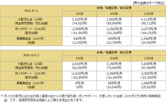 ドコモは、国内3社目として、iPhoneに続いて今年6月にiPadの取り扱いを開始した。ドコモショップなどに加え、ドコモオンラインショップでも販売する。税込みの現金販売価格は、新規/機種変更/契約変更とも、「iPad Air 2」の16GBが7万4520円、64GBが8万5968円、128GBが9万8712円、「iPad mini 3」の16GBが6万2856円、64GBが7万5600円、128GBが8万7480円。指定の条件を満たす場合に、最大24か月間、機種ごとに一定金額を割り引く「月々サポート」を適用した場合の実質負担額は、「iPad Air 2」の16GBが1万2960円(540円×24回)、64GBが2万3760円(990円×24回)、128GBが3万4560円(1440円×24回)、「iPad mini 3」の16GBが0円、64GBが1万4040円(585円×24回)、128GBが2万5920円(1080円×24回)。実質負担額0円の「iPad mini 3」の16GBなら、通信料金だけで使用できる。