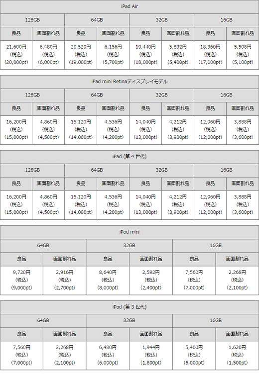 2014年10月24日~11月30日の下取り額一覧