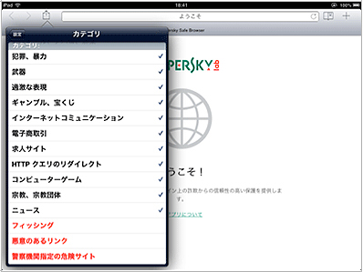 犯罪・暴力、武器、過激な表現、ギャンブルなど、不快なコンテンツを含む可能性のある14種類のカテゴリのなかから、閲覧しないカテゴリを選択することができる。クラウドベースのアンチウイルスネットワーク「Kaspersky Security Network」を利用して、サイトの情報を常に更新。日々、新たに出現する危険なサイトにも対応してブロックする。対応OSは、iOS 8/7/6。