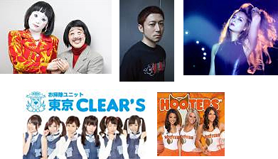 左上から、日本エレキテル連合、DJ Hasebe、エリー・ローズさん。左下から、東京CLEAR'S、Hooters