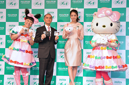 発表会では、チェキのデザインに採用されたハローキティと、「ハローキティが大好き」と語る女優の佐々木希さん、お笑いコンビのフォーリンラブのバービーさんが登場した。