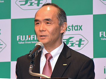 記者会見の冒頭、イメージング事業部の山元正人事業部長は「日本だけではなく、アジア、アメリカ、ヨーロッパなど、世界中に『チェキ』ブームが広がっている。今年のシリーズの目標販売台数は300万台だったが、好調を受けて350万台に上方修正した。新モデルを投入することで、さらに伸びることを期待している。また、出荷台数の増加を見込んで、来春には生産能力の20~30%アップを図る計画だ」と、現在の好調を説明した。