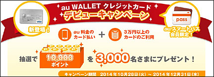 10月28日~12月31日には、「au WALLET クレジットカードデビューキャンペーン」を実施。期間中にau WALLET クレジットカードに申し込んだ「auスマートパス会員」が対象で、抽選で3000名にWALLET ポイントを1万ポイントをプレゼントする。