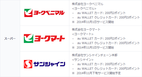 「au WALLET」サービスの「ポイントアップ店」は、11月1日から順次拡大する。東北から北関東を中心に展開するヨークベニマルや、南関東を中心に展開するヨークマート、高知県を中心に展開するサンシャインの各スーパーを加え、11月末には、24社/約2万2000店舗になる。