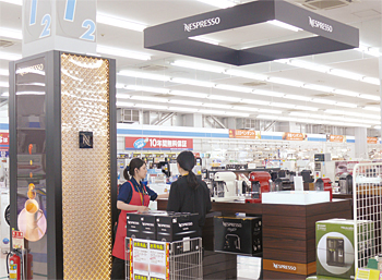 ケーズデンキ東京ベイサイド新浦安の主要客層は、40~50歳代。休日は、中学生くらいの子どもがいる家族連れが中心だという。お金に比較的余裕があって、生活を豊かにするデジタル機器・家電を購入するお客様が多く、「売れ筋は上位機種や最新モデル」(遠藤店長)だ。話題の商品にも関心が高く、「例えばコーヒーメーカーでは、手軽に本格的なコーヒーが楽しめる『ネスプレッソ』が人気。試飲できるように専用のコーナーを設けたところ、とくにコーヒーメーカー目当てではなく来店したお客様が興味を示し、即決で購入することもある」という。