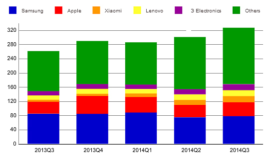 米IDC、2014年第三四半期の世界スマートフォン出荷台数は前年比25.2%増、中国・小米科技がシェア3位に