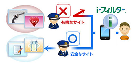 犯罪を助長するようなサイトやアダルトサイトなどに、子どもが不本意にアクセスすることを防止するフィルタリングサービス。個人情報を引き抜く危険の恐れがあるアプリなどを起動する際には、警告画面を表示し、子どもにとって有害なアプリの利用を防止する。端末の利用時間制限や通話の発着信履歴、子どもが行った場所や居場所を確認できる機能も備える。