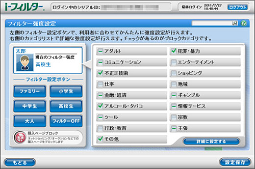 親が子どもの端末を直接操作することなく、PCから保護者用の管理画面にアクセスし、ブロックリストや各アプリの利用可否、インターネットの利用時間などの設定ができる。子どもの生年月日を入力するだけで、自動的にアプリフィルターを推奨強度に設定することができる。サイトは67カテゴリ、アプリは32カテゴリから選択し、子どもの成長や家庭のルールに沿ってブロックするサイトやアプリを設定できる。LINEやTwitterなどのアプリは、最初の利用登録時に許可/禁止を設定できる。
