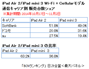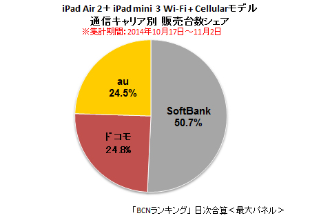 「iPad Air 2」と「iPad mini 3」を合わせた11月2日までの累計でのキャリア別販売台数シェア(累計キャリア別シェア)は、ソフトバンク50.7%、ドコモ24.8%、au24.5%で、比率はほぼ2対1対1だった。