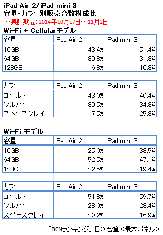 カラー別では、「iPad Air 2」「iPad mini 3」とも、新色のゴールドが最も多く、シルバー、スペースグレイと続く。前面カラーがホワイトのゴールドとシルバーの差は小さく、ほぼ拮抗している。Wi-Fiモデルに限ると、「iPad Air 2」「iPad mini 3」ともに、セルラーモデルよりゴールドの割合が高く、半数以上を占める。タイプによる売れ筋カラーの違いは興味深い。(BCN・嵯峨野 芙美)
