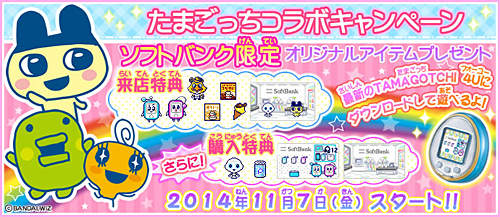 ソフトバンクモバイルは、バンダイとコラボレーションし、「たまごっち」シリーズの最新機種「TAMAGOTCHI4U」にダウンロードして遊ぶコラボキャラクターや限定データを、全国のソフトバンクショップでプレゼントする「たまごっちコラボキャンペーン」を開始した。