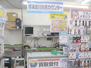 パソコンの不具合は、修理受付総合カウンターで対応。ドスパラが販売しているカスタマイズパソコンに限らず、メーカー製のパソコン修理も受け付けることで、地元住民の信頼を高めている。