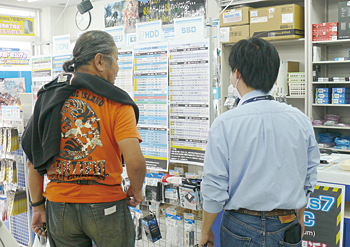 常連のほとんどは、Windows XPの発売時にはすでにパソコンを使っていたという「比較的高齢のお客様」(守店長)だ。店頭での会話も、「例えば、Windows 98発売のときの話で盛り上がる」など、昔話になることもあるそうだ。地元住民のなかには、パソコンにあまりくわしくないお客様も少なくない。そこで、「住民の方々とは、周辺地域の話題でコミュニケーションをとっている」。初級者と上級者への接客を切り分けることで、地域密着型でありながら、広い地域に常連を抱える店舗として定着した。