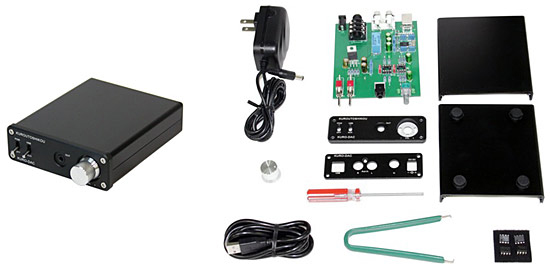基板とケースを組み立てて完成させるUSB DACヘッドホンアンプ。デジタル(USB)とアナログ(AUX)で入力の切替えができる。付属のケーブルでUSB接続、Windows機器のオーディオ装置として利用できる。