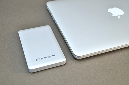 スタイリッシュな外観は、アップルのノートPC、Macbookシリーズや一体型のiMacと並べて置くとよくマッチする。筆者が使っているMacbook Pro Retina(Mid 2014)と「StoreJet 500」を並べたところ、見事なデザインマッチングだった。
