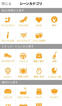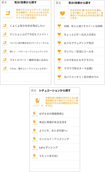 シーンカテゴリの「気分/効果から探す」は、「テンションアップ」のほか、「リラックス」「LOVE」「集中」などを用意。「LOVE」では、彼氏や彼女と一緒にクリスマスを過ごすときにぴったりな曲などを探すことができる。また、「シチュエーションから探す」のなかには、「エクササイズ」「ドライブ」「通学/進学」「家事」「こどもと一緒に」などがあり、「こどもと一緒に」を選べば、クリスマスだけでなくふだんから子どもに聴かせる曲を多数紹介する。「場所から探す」は、「リビング」「バス/トイレ」「ベッド」「キッチン」などから選ぶことができる。