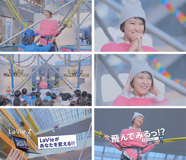 「LaVie CHALLENGE!!篇」は、13.3型ワイド液晶を搭載するノートPCとして世界最軽量の「LaVie Z LZ750/TS」の軽さを表現するテレビCM。武井咲さんが選んだサルのぬいぐるみと「LaVie Z LZ750/TS」を天秤の上に置き、「LaVie Z LZ750/TS」の軽さを調べる企画「LaVie CHALLENGE」に挑戦する。サルのぬいぐるみのほうが重いという結果を受けて、逆バンジー装置をつけた武井咲さんが瞬時に天高く吊り上げられる。