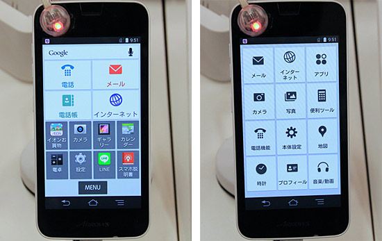 ホーム画面(左)はよく使う項目がひと目で視認でき、画面下部のアプリリアイコンは入替えができる。「MENU」)をタップした後の画面(右)も非常に見やすい
